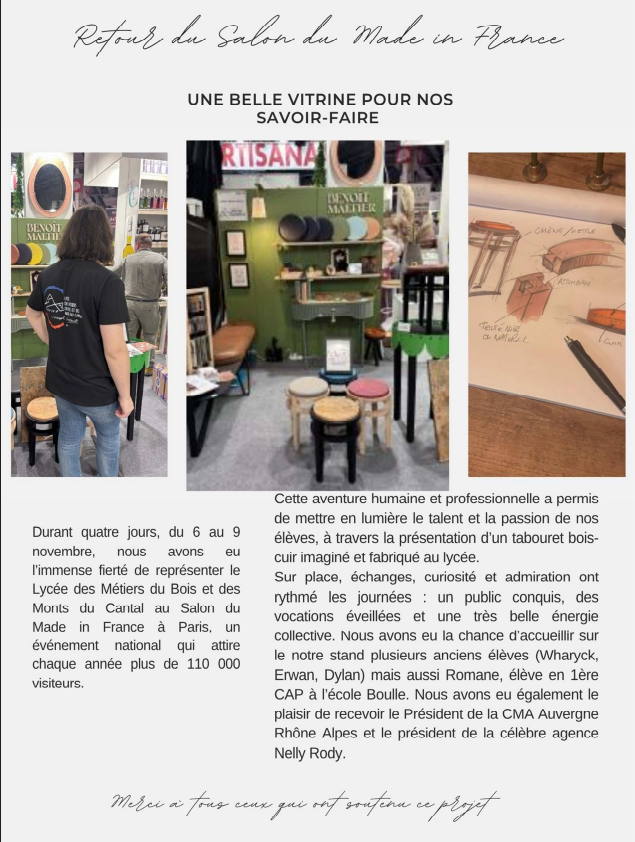 du 6 au 9 novembre, nous avons eu l'immence fierté de représenter le Lycée des Métiers du Bois des Monts du Cantal au Salon du Made In France à Paris ! Cliquez sur cette Actu !